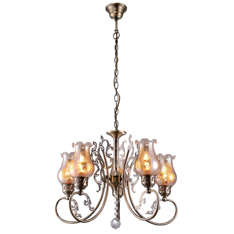 Люстру оптимально установить в интерьере в стилистике классика и кантри. Арматура из металла, цвет бронзовый, подвески прозрачные, плафоны коричневые из стекла. Люстра имеет защиту IP20.